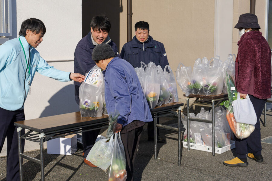 久世支所は支所協同活動として、12月16日に地産池消のPRと地域住民と絆を深めることを目的に、支所駐車場で新鮮な地場産農産物を販売する朝市を開催し、来場者に記念品として花苗をプレゼントしました。また、毎週火曜日に開催している朝市のPRを行いました。