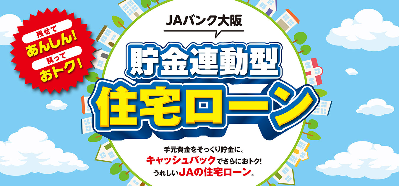 JAバンク 貯める・借りる 便利なサービス 各種相談会 金利・手数料 商品概要説明書 各種規定/お知らせ 貯める・借りる JA貯金 普通貯金・貯蓄貯金・定期積金・定期貯金の4種類の貯金方法をご用意しています。お金の使いみちや、目標額に合わせてお選びいただけます。 JAローン お客様のライフプランニングやニーズに合わせて、様々なローンをご用意しています。これからの生活設計にお役立てください。 便利なサービス JAカードのご案内 「JAならでは」の特典を備えたクレジットカードをご紹介いたします。 給与受取サービス 全国約8,300店舗のどこでも給与のお引き出しができます。 年金受取サービス 国民年金・厚生年金も、どこでもお引き出し可能です。 JAバンクの手数料無料ATM ATMによるご入金、ご出金、残高照会サービスが終日無料。 個人向け JAネットバンク パソコンから、残高照会や振込などの各種サービスがご利用できます。 JAネットローン 24時間365日受け付け、様々なローンを取りそろえています。 各種相談会 住宅ローン相談会 セカンドステージ応援相談会 金利・手数料 貯金金利表 ローン金利表 手数料一覧 商品概要説明書/定型約款 商品概要説明書 定型約款 各種規定/お知らせ JAバンクセーフティネット ご利用者の皆さまへの取引時確認に関するお願い JA教育資金贈与専用口座のご案内 JAバンクからのお知らせ JAバンク大阪(JA/信連)重要なお知らせ