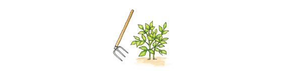 一つのイモからたくさん芽が出るので、草丈10cmになったら生育のよい1本を残して間引く。アブラムシなどの防除は早めに。