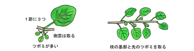 (2)また、摘心した節から再び伸びてきたら、小さいうちからかき取る