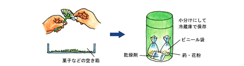 開花前日のやや開きかけの蕾を取り、葯(花粉の袋)を集め、広げて1日室内に置くと花粉が出る。