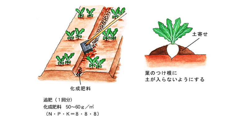 2回めと3回めの間引き後、条間に追肥し、土寄せする。葉を傷めたり、葉のつけ根に土が入り込んだりしないように注意する。