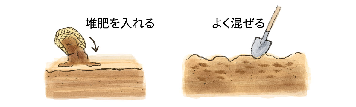 石灰が土を中和するまでには2〜4週間ほど、堆肥が土になじむまでには約2週間ほどかかる。そのため、植え付けの約4週間前から土作りを始めるのが理想だ。