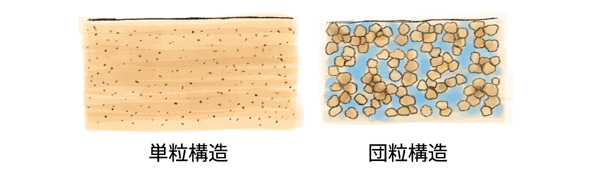 耕うんには大きく三つの役割がある。①土を柔らかくして根が伸びやすくすること、②空気の通りを良くすること、③水はけを良くすることだ。畑の土には「単粒構造」と「団粒構造」があり、作物の栽培に適しているのは団粒構造の土である。耕うんを行うことで団粒構造が促され、土そのものの性質が良くなる。堆肥を入れるのも、この団粒構造を作りやすくするためなのだ。