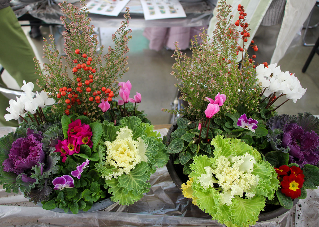 初めに花の選定方法や組み合わせの基本、植え付け時の注意点等を学び、クリスマスからお正月以降も楽しめるよう、ジャノメエリカやシクラメン、葉ボタンなど5種類の花をバランスよく配置し、寄せ植えを楽しみました。