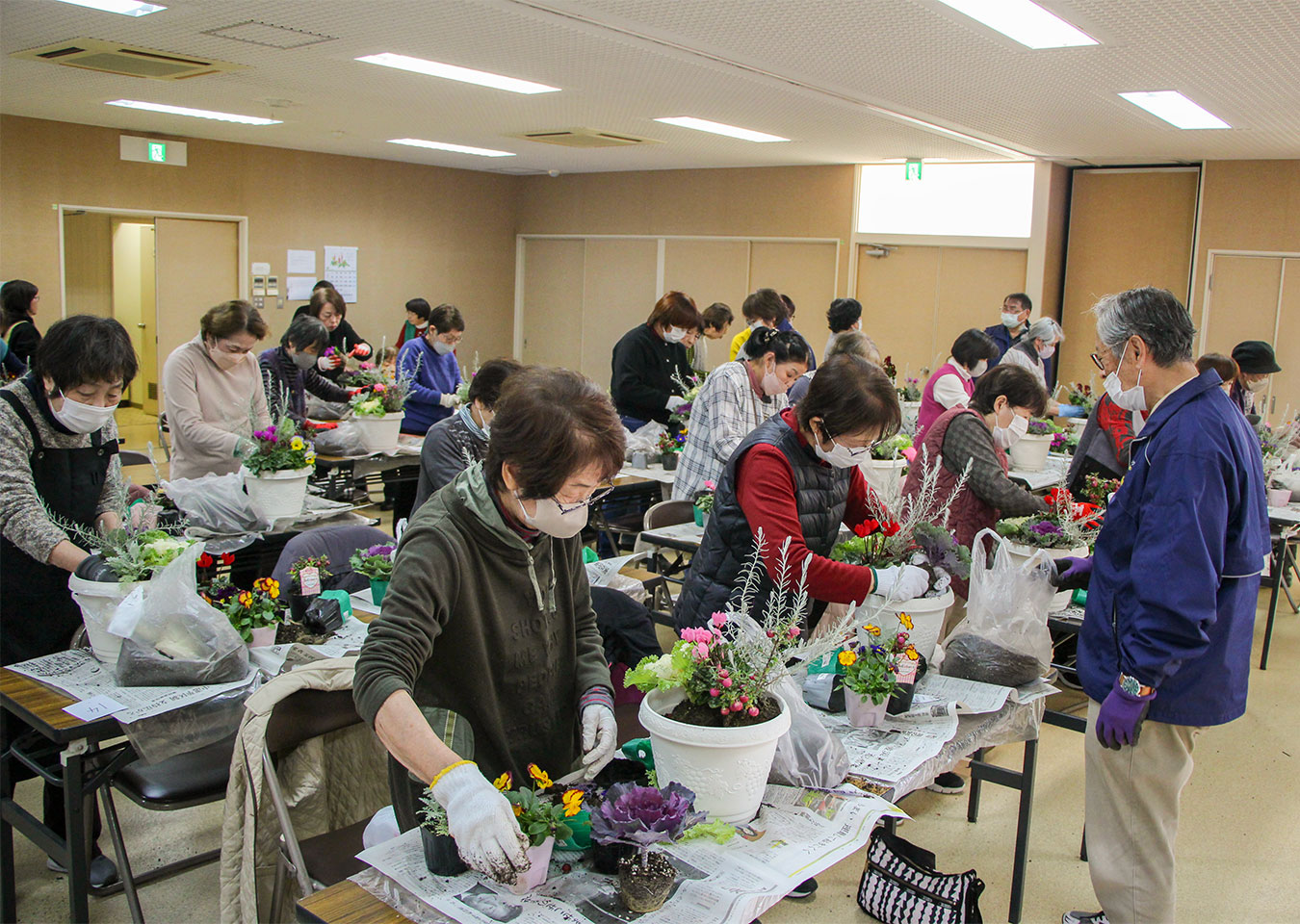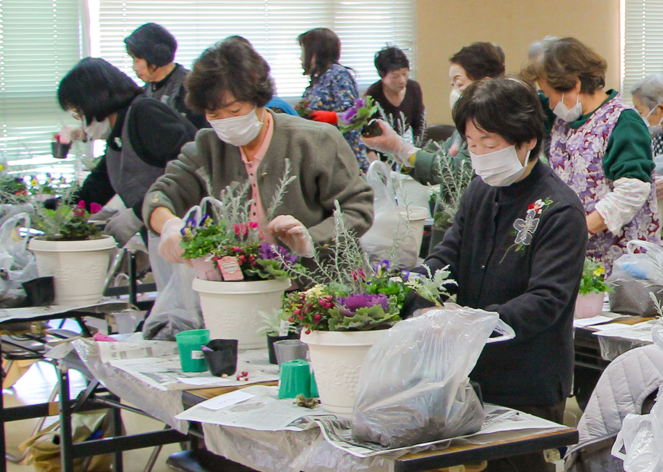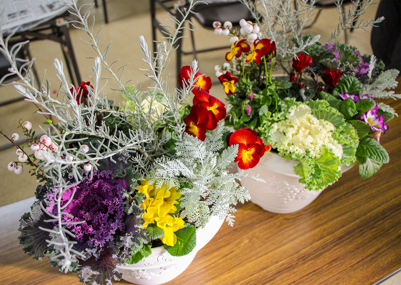福泉支部が寄せ植え講習会を開催 2025.12.19 女性会だより 12月16日に2班に分かれて74人が参加して、NPO法人グリーンカレッジ大阪の的場氏を講師に「寄せ植え講習会」を開催しました。 はじめに花の種類や特徴、配置の仕方などのコツを学び、葉ボタンを中心にジュリアン、エレモフィラ、シクラメンなどをバランスよく配置し、お正月用の寄せ植えを完成させました。